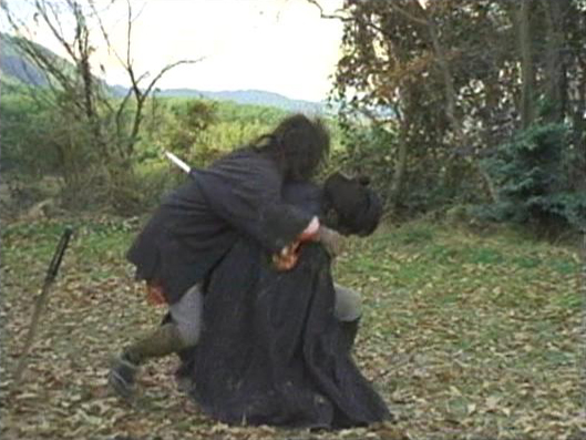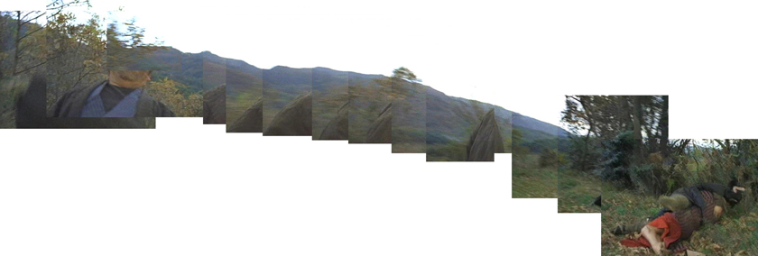 | 紋次郎にぶった斬られる悪党B。山すそが少し見えている。 ↓ |