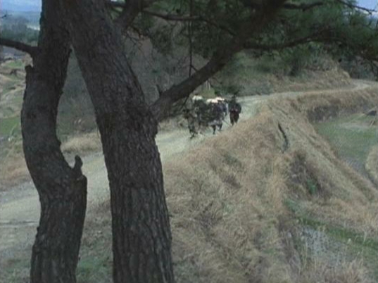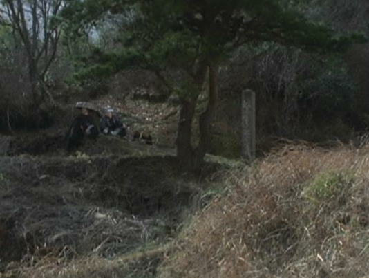 | 紋次郎を追ってくる清五郎一家。画面左端の景色を見る限り、かなり高所にあり、遠方まで見通しが利く場所である。 ↓ |