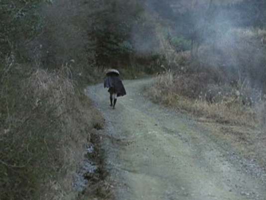 | 「第3話 峠に哭いた甲州路」で街道を下ってくる紋次郎。画面左に二股の木がある。 ↓ |