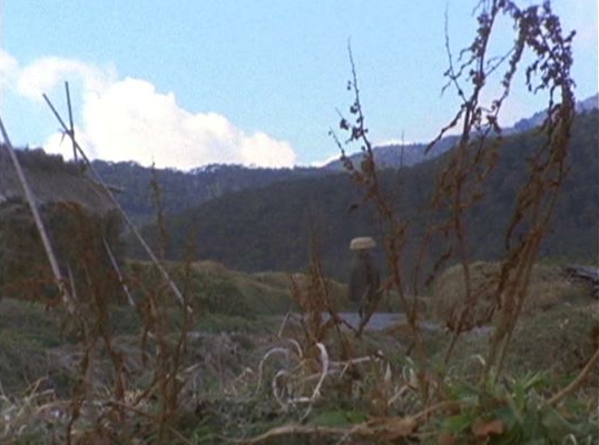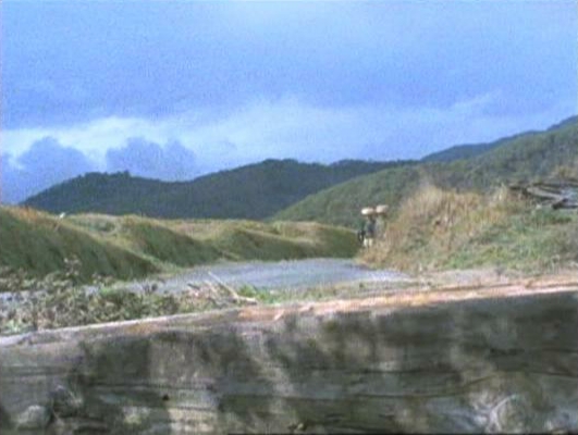 | 「白刃を縛る五日の掟」で坂道を下ってくる紋次郎と林与一。 ↓ |
