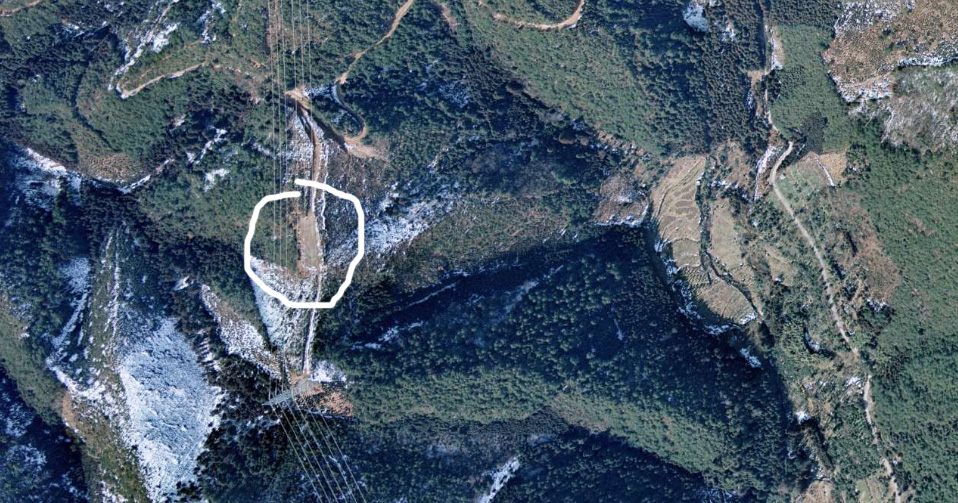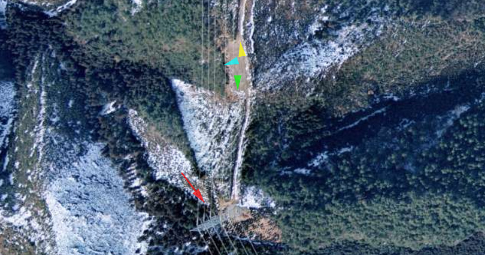 | ↑ 黄色い三角は画像Aの撮影方向、 水色の三角は大立ち回りの撮影方向、 黄緑の三角は画像Bの撮影方向、 赤い矢印は画像Bに写りこんでしまった鉄塔である。 |