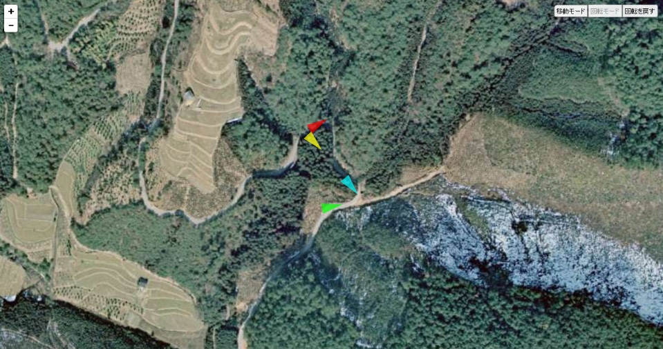 | ↑ 赤い三角は画像A、 黄色い三角は画像C、 黄緑の三角は画像E、 水色の三角は画像Gの撮影方向である。 |