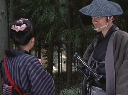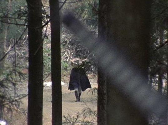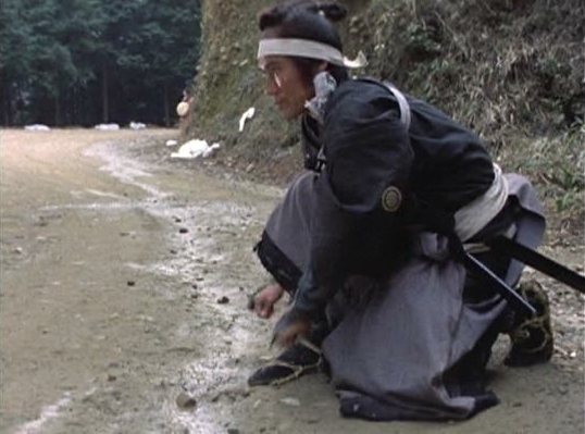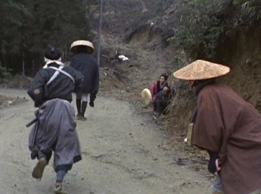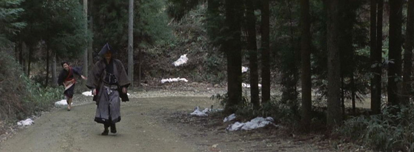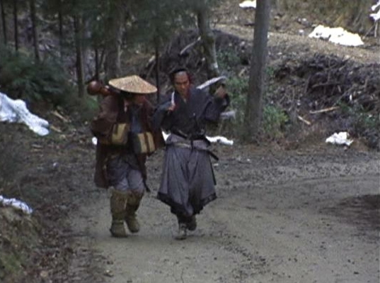 | 紋次郎のあとを追うお侍さん。右に見える焼け焦げたような打ち捨てられた木が画像Cと一致。 ↓ |