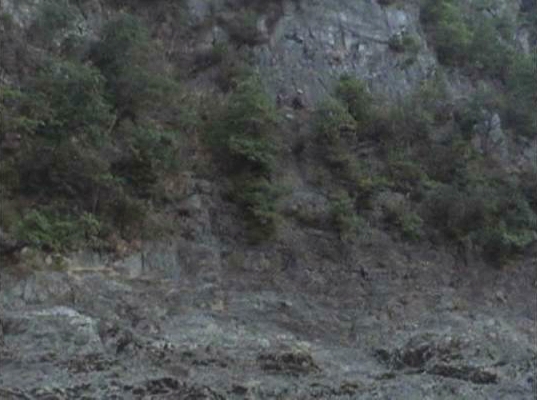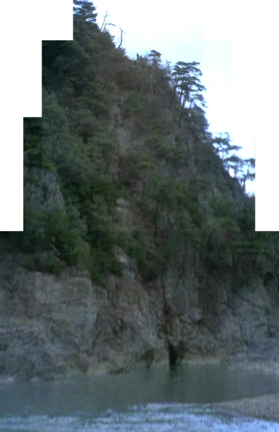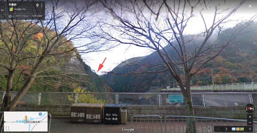 | ↑ 保津峡駅前から取得した画像。最新の物は手前の木立ちが邪魔だったので、2009年の物を使った。赤い矢印あたりが旧道部分。もちろんカメラ位置はここではなく、もっと右手の低い位置から見上げて撮っている。 これだけではロケ地の根拠としては弱いのだが、細部の比較は「保津峡 壁岩」で画像検索されたい。 |