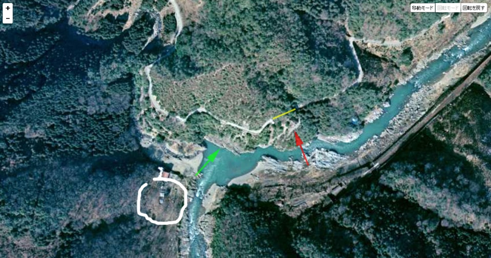 | ↑ 古い航空写真なので写っていないが、白く囲ったあたりに現在のJR保津峡駅(トロッコ保津峡ではない)がある。 黄色い線は1941年に竣工した鵜飼隧道(ずいどう)であるが、そのため赤い矢印に見える道が旧道となり、そこでロケを行っている。旧道には何ヶ所か路肩の崩落らしきものが見える。黄緑の矢印は画像Bの撮影方向。 なおこの旧道は非常に危険らしく「立入禁止」となっているので、安易に立ち入らないように。 |