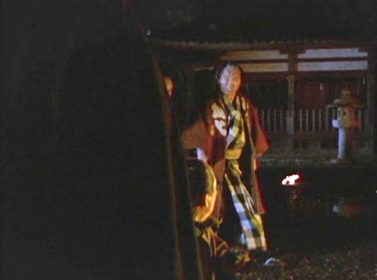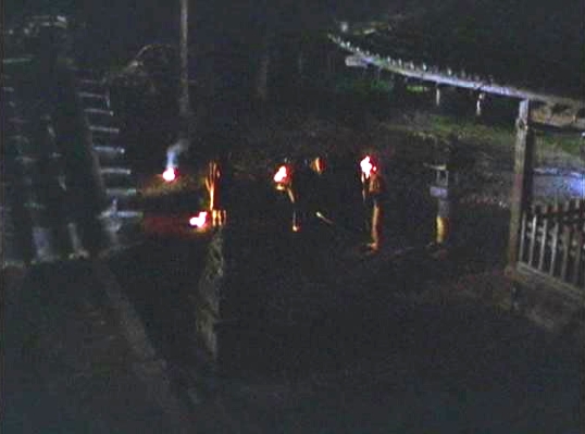 | 舞台と石灯籠。この石灯籠は画像Aの物と同じ。舞台の屋根の下部は漆喰塗り。舞台が赤く見えるが、これは松明のせいだろう。石灯籠の支柱(竿)の中間部分は少し膨らんで、節があるように見える。 ↓ |