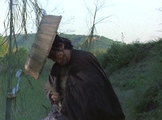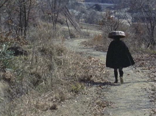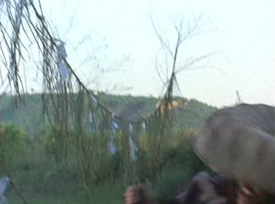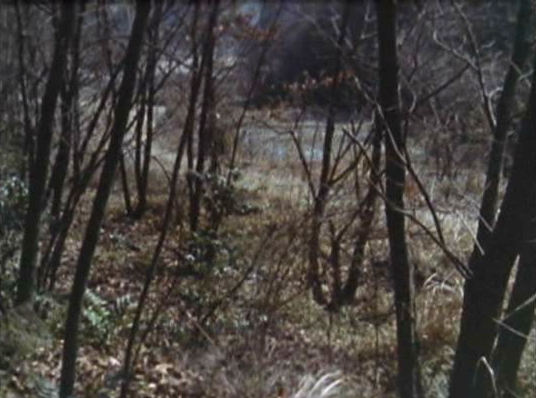 | 「水車は夕映えに軋んだ」の、もう1つの自動車の写りこみシーン。かなり拓けた斜面の荒地。影の具合から見て左手が南であろう。 ↓ |