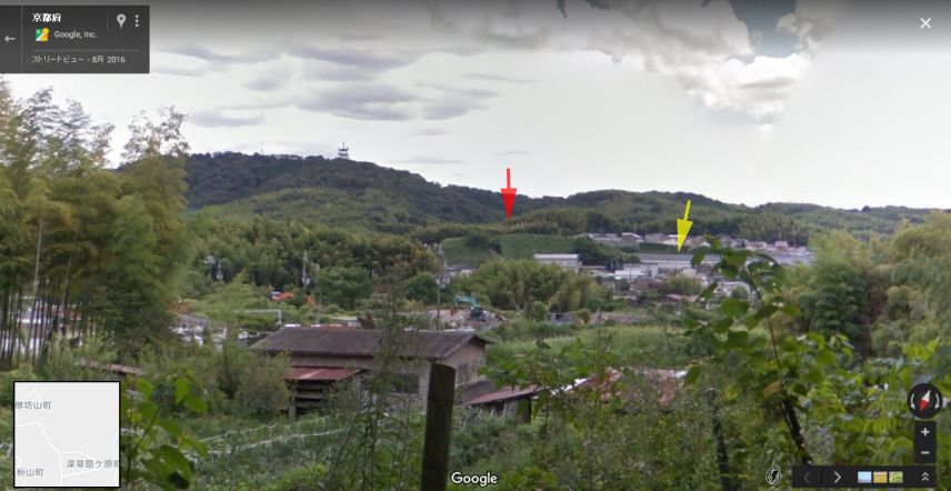 | ↑ 画像Bは黄色い矢印方向に、画像Cは赤い矢印方向に撮ったと思われる。場所は「京都市山科区観修寺南大日」 |