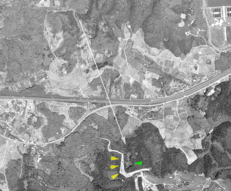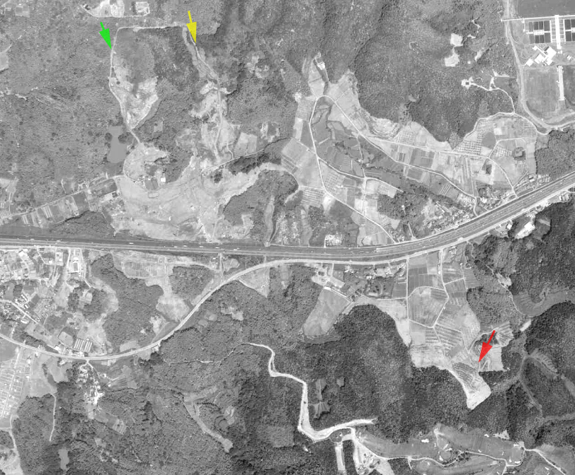 | ↑ 現地からの見通しが悪かったため、やや西の黄緑の矢印あたりから南方向を見たもの。黄色い矢印が名神高速道路の防音壁、赤い矢印が高速道路をさえぎる小山。おおむね画像Aの特徴と合致している。 国土地理院の「国土変遷アーカイブ」による現地周辺の1975年撮影の航空写真。(画像B・Cのロケ推定地のアップ) ↓ |