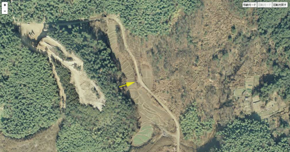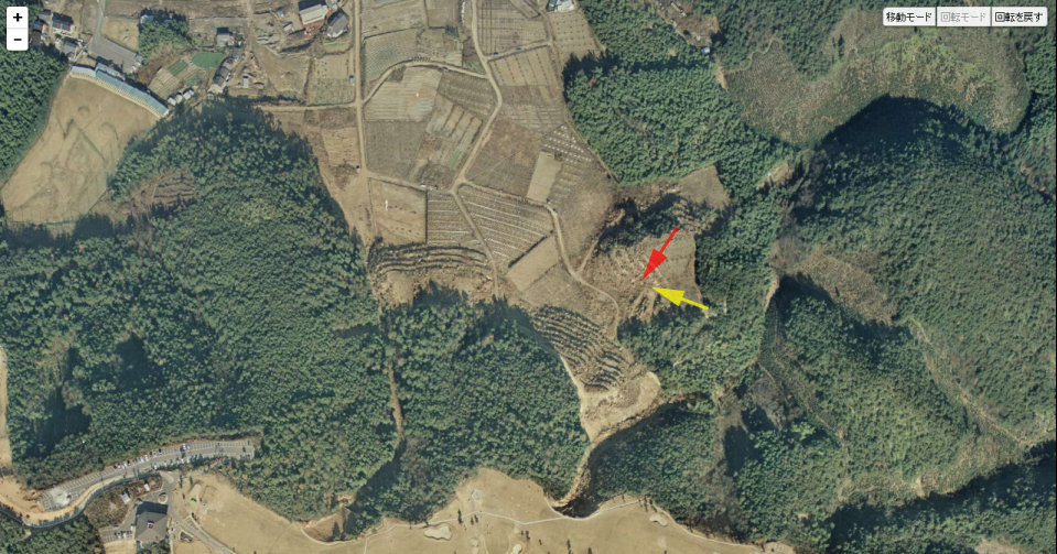 | 「無縁仏に明日を見た」の画像。画像右の赤茶けた地山と、その左手の木立ちの薄い部分に注目。 ↓ |