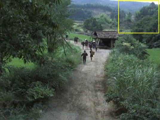 | ↑ 画像EからGまでの4枚は、白い矢印方向に撮っている。赤茶けた地山は、黄色い矢印の山道の法面だと思われる。また黄緑の矢印には、木立ちの薄い場所が見られる。 以上から「無縁仏に明日を見た」のこれらのシーンは「水車は夕映えに軋んだ」の茶店と同じ場所。 |