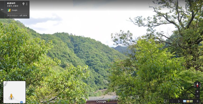 | グーグルのストリートビューの画像。もう少し西からの画像が欲しいのだが、木立ちが邪魔をして取得できなかった。眼下にチラリと見えているのはJR保津峡駅。 ↓ |