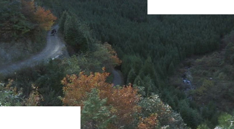 | このシーン。右手に谷川が見える。(切り貼り合成画像) ↓ |