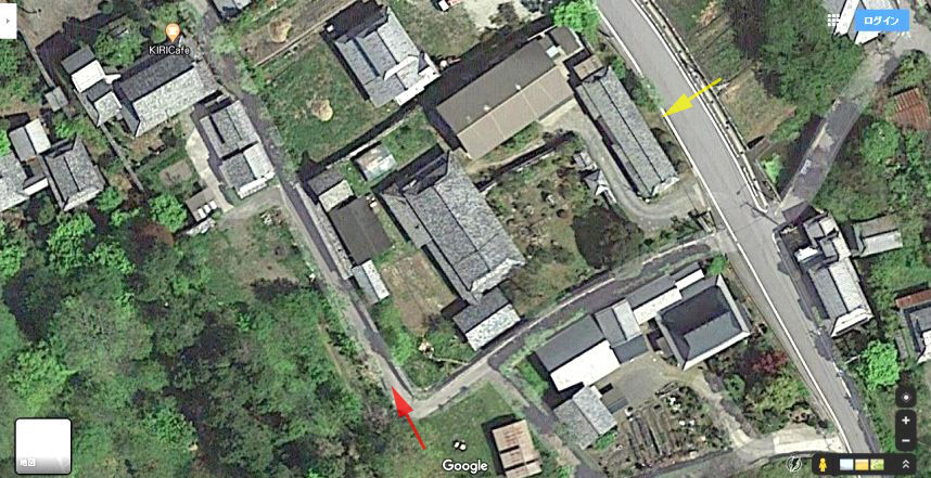 | グーグルマップによる現地画像。黄色い矢印は長屋門、赤い矢印は屋敷裏手。 ↓ |