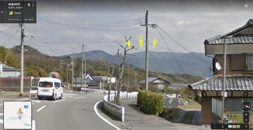| 現地からの見通しが悪いため、千代川町の平地から取得したグーグルのストリートビューの画像。土採り場の上の方に上がると、黄色い矢印の山並みが画像Aのように高まって見えるのかもしれない。 ↓ |