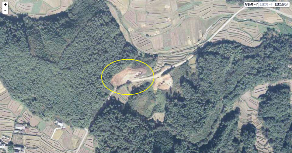 | 国土地理院の「国土変遷アーカイブ」による現地周辺の1975年撮影の航空写真。黄色い円内の土採り場がロケ地かと思われる。 ↓ |