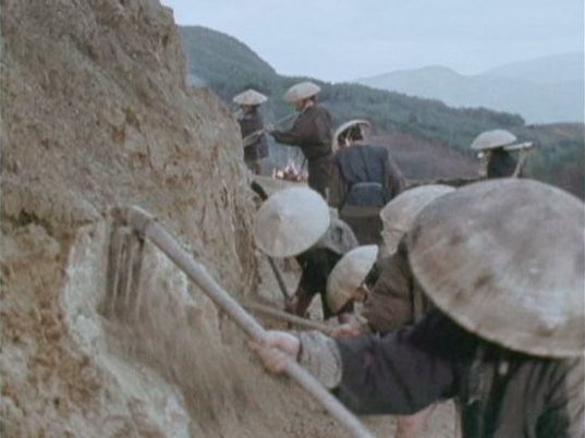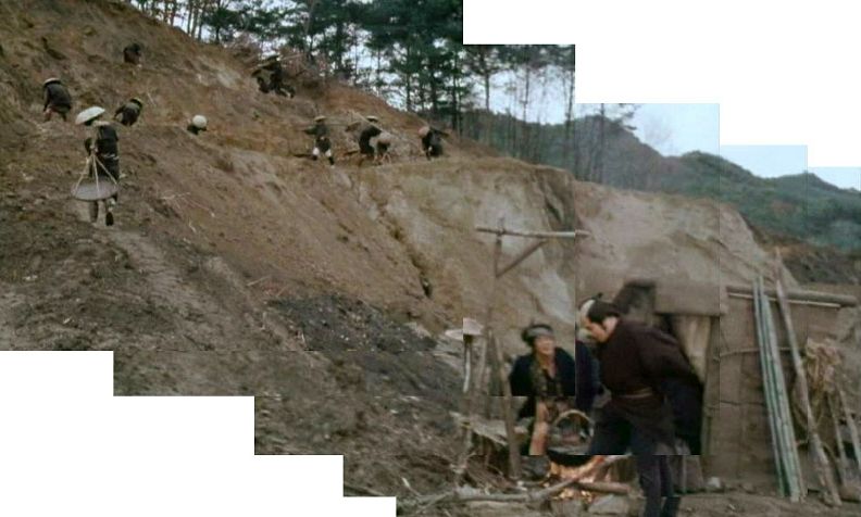 | 「お耳役秘帳」(1976年)の第17話「お耳役狩り」の同地のシーン。左上の山並みの雰囲気が一致。土採り場の上の方に上がると、画像Aのように見えるのかもしれない。 ↓ |