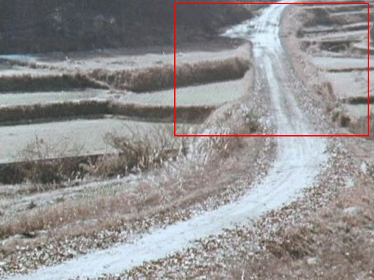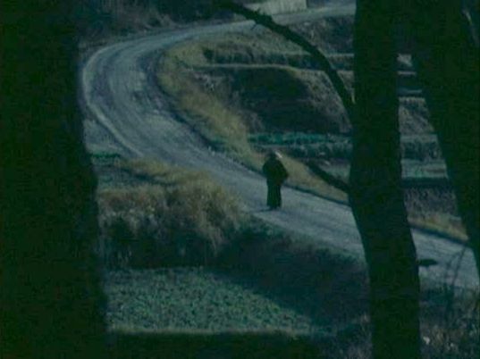 オープニングの街道シーン。映っているのは赤い枠あたりである。ただしカメラはもっと左から撮っている。