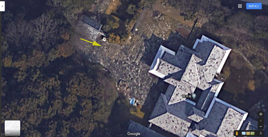 グーグルの空中写真。玄関前が石畳で覆い尽くされているように見える。黄色い矢印方向に撮っている。