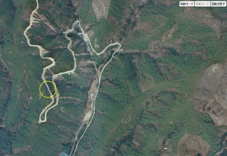国土地理院の「国土変遷アーカイブ」による1974年撮影の航空写真。本編は黄色い円内(南へ向かっての下り坂)から東を見ていると思う。画像下端に富栄池が見える。