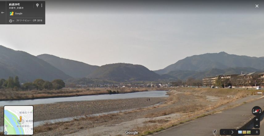 京都の嵐山の桂川左岸から取得したグーグルのストリートビューの画像。山並みが一致。