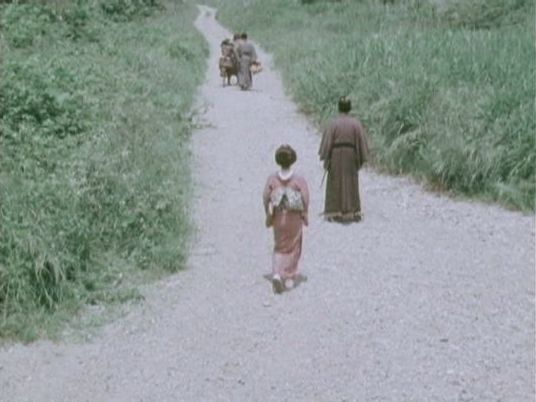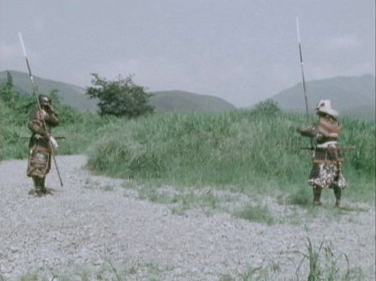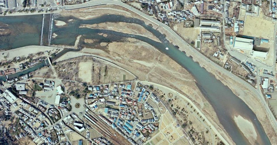 国土地理院の「国土変遷アーカイブ」による現地周辺の1975年撮影の航空写真。河原の右下から左上に伸びる直線の砂利道がロケ地かと思われる。