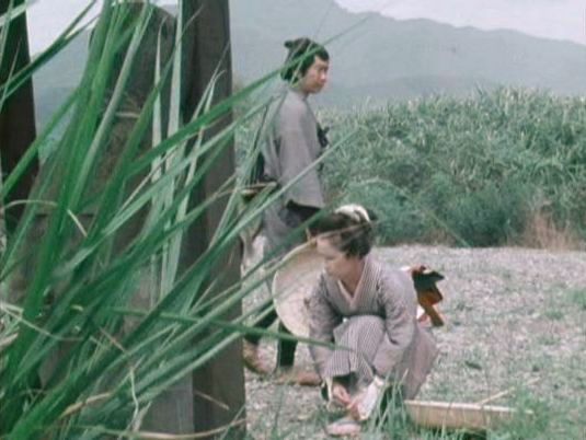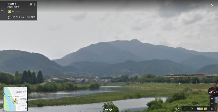「京都市右京区嵯峨罧原(さがふしはら)町」の桂川堤防から取得したグーグルのストリートビューの画像。山並みが一致。上のシーンでは愛宕山の山頂を隠している。ロケ場所はおそらく桂川の河原であろう。