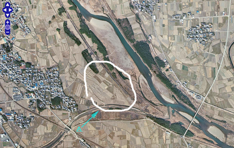 ストリートビューの画像はAのあたりから矢印方向に取得した。白い線で囲んだあたりの田んぼがロケ地であろう。