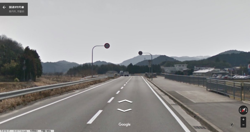 | グーグルのストリートビューで現地の南東方向を見た画像。左側の山並みが一致。今では堤防上を国道372号線が通っている。なお上記の橋はもう無い。 ↓ |