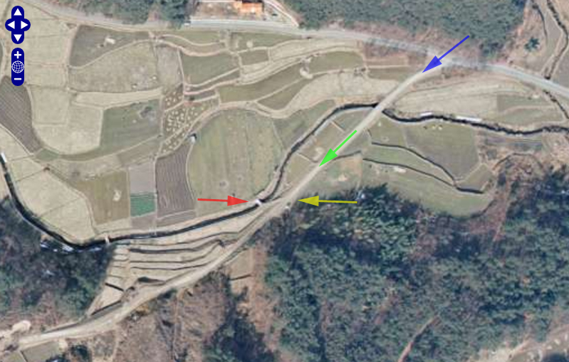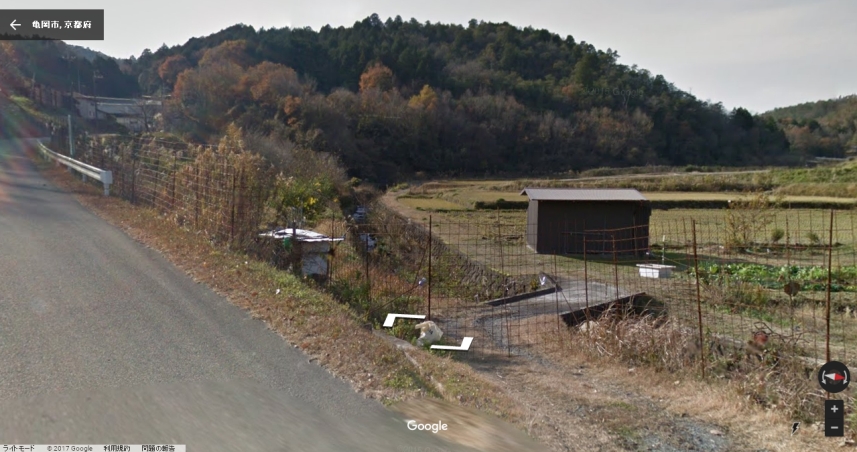 | グーグルのストリートビューの画像。画像Bと同じアングルであるが、視点が高いのでしっくりこない。画像Aの小さな橋と小道も見える。 ↓ |