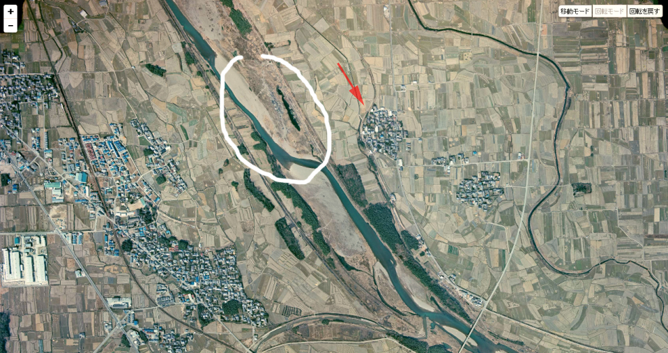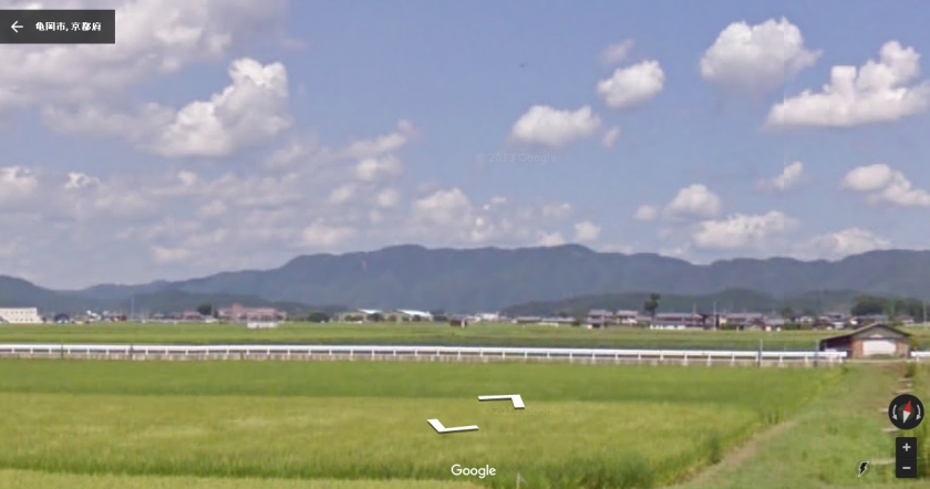 | グーグルのストリートビューで現地周辺から北方向を見た画像。山並みが一致。堤防近辺にストリートビューが通っていなかったため、現地のやや東の田んぼから画像を取得した。 ↓ |