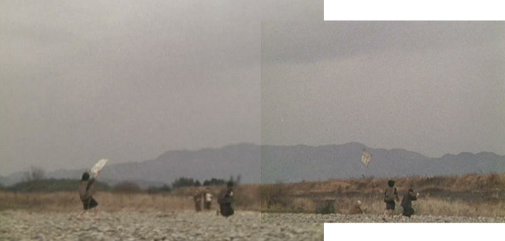 | このシーン。広い河原に堤防が続いている。(切り貼り合成画像) ↓ |