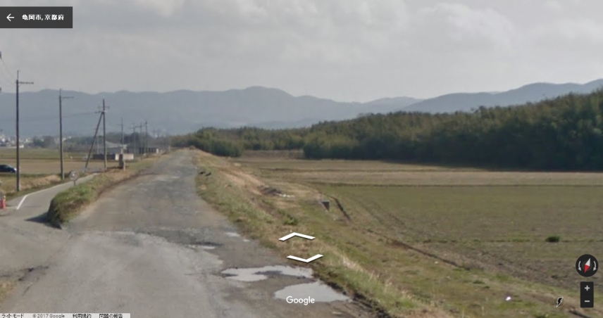 | グーグルのストリートビューで現地の南方向を見た画像。山並みが一致。 ↓ |