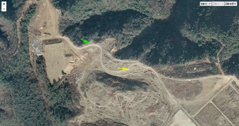 | 国土地理院の「国土変遷アーカイブ」による西山団地北西部の1974年撮影の航空写真。 本編画像は黄色い矢印方向に撮っていると思われるが、黄緑の矢印方向でも撮れそうな気がする。 ↓ |