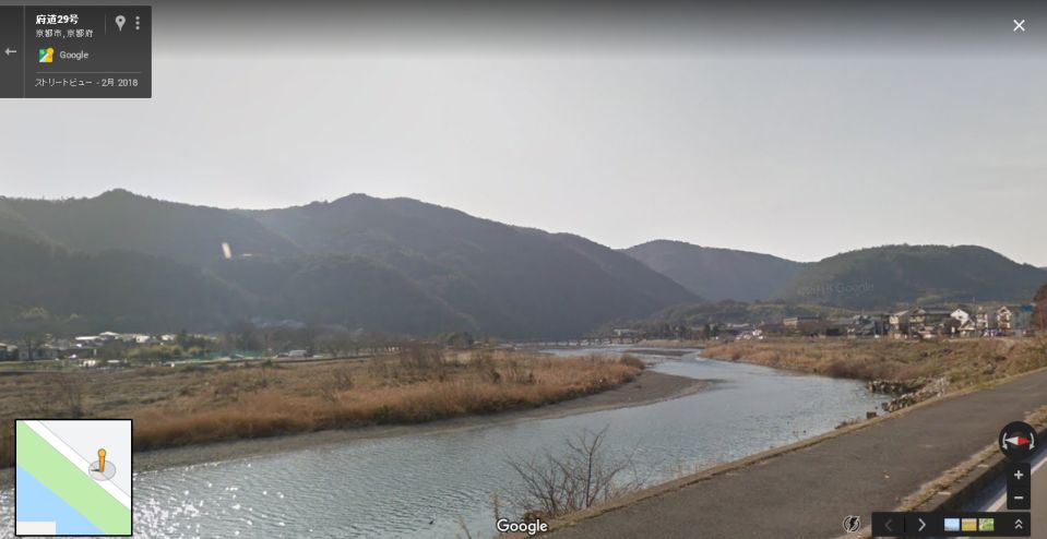 | 京都の嵐山の桂川左岸から取得したグーグルのストリートビューの画像。山並みが非常に似ていると思うのだが?ロケ場所は対岸の河原か? ↓ |