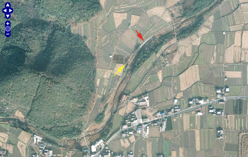 | 国土地理院の「国土変遷アーカイブ」による現地周辺の1975年撮影の航空写真。 本編画像は黄色い矢印方向に撮っており、赤い矢印の白い物体(コンクリートの護岸?)が本編に映りこんでいると思われる。 ↓ |