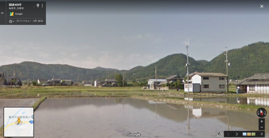 | グーグルのストリートビューの画像。遠景の山並みが一致しいていると思う。ロケ地はもう少し北の犬飼川の河原であろう。 本編冒頭の街道が「曽我部町犬飼上和田」あたりなので、そのついでに撮ったのではなかろうか? ↓ |