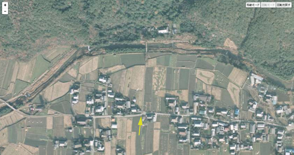 | 国土地理院の「国土変遷アーカイブ」による現地周辺の1975年撮影の航空写真。本編画像は黄色い矢印方向に撮っている。 ↓ |