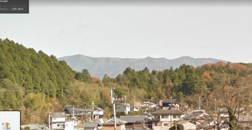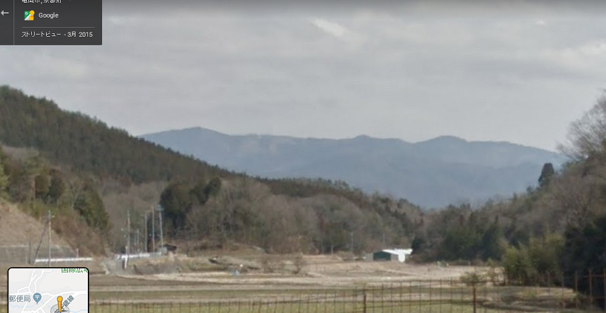 | 京都府亀岡市宮前町神前周辺から取得したグーグル・ストリートビューの画像。東を見ている。山並みが一致。 ↓ |