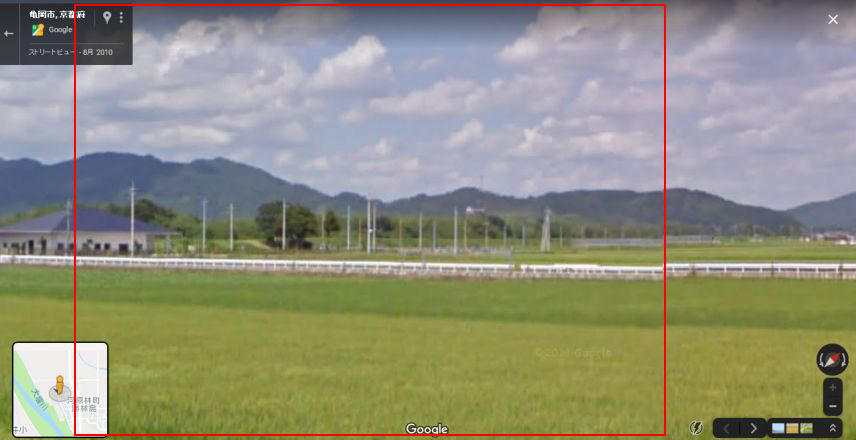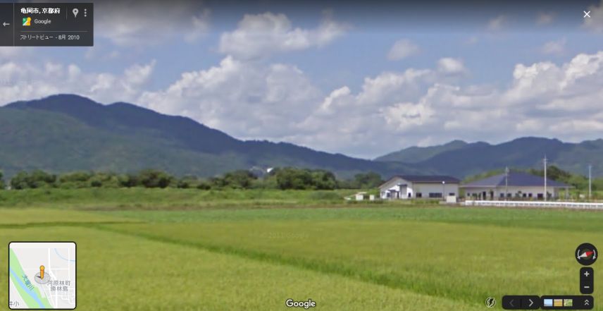 | 京都府亀岡市河原林町勝林島から取得したグーグル・ストリートビューの画像。山並みが一致。ロケ地はおそらく桂川の左岸近くの田んぼ。 ↓ |