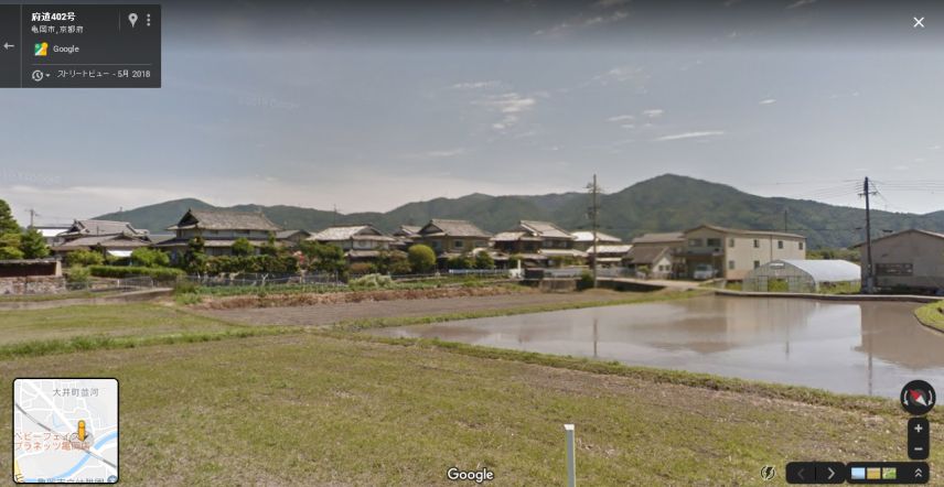 | グーグル・ストリートビューの画像。ロケ地は家並みの向こうの、桂川沿いの田んぼだと思われる。 ↓ |