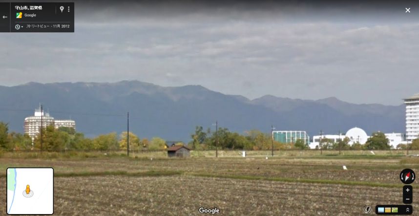 | グーグルのストリートビューの画像。旧流路からは遠景の見通しが悪かったので、やや東の農地からの画像。 ↓ |