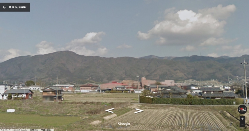 グーグルのストリートビューで現地から東方向を見た画像。左端に画像の繋ぎ目のズレがある。