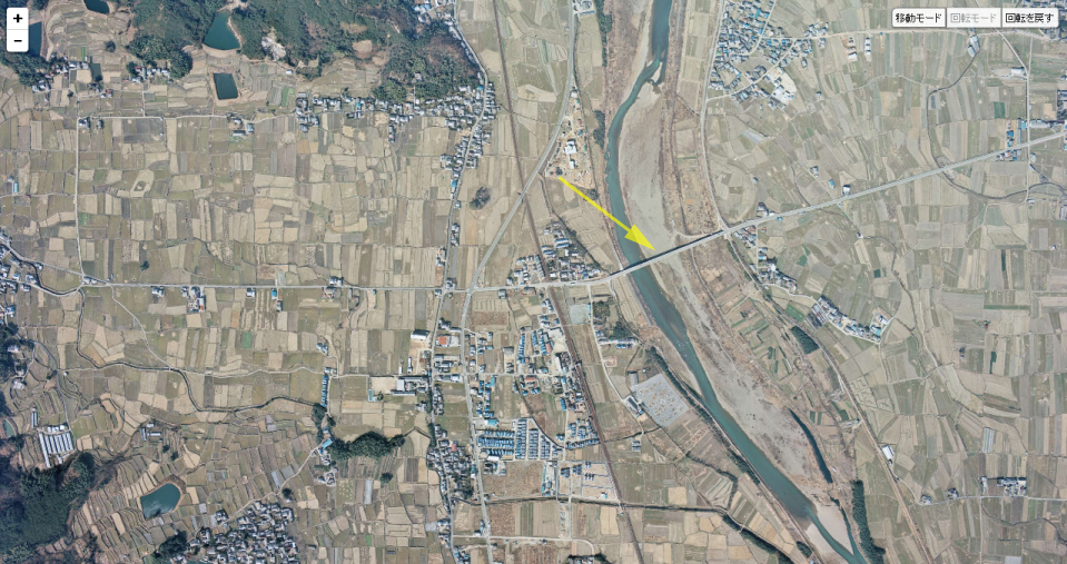 国土地理院の「国土変遷アーカイブ」による現地周辺の1975年撮影の航空写真。黄色い矢印が月読橋。