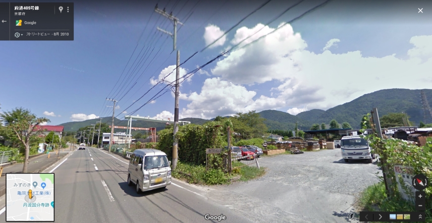 現地から北東方向を見たグーグルのストリートビューの画像。遠景の山並みが一致。