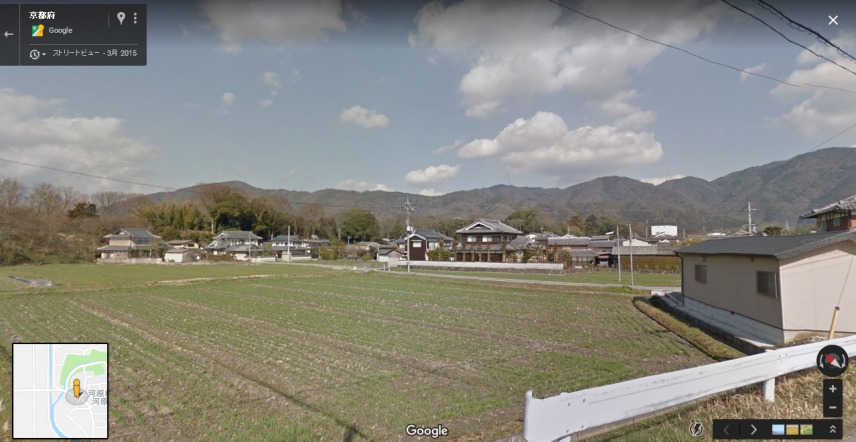 現地近くから東方向を見たグーグルのストリートビューの画像。遠景の山並みが一致。