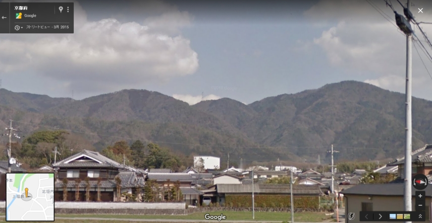 現地近くから北東方向を見たグーグルのストリートビューの画像。中央から左にかけての山並みが一致。