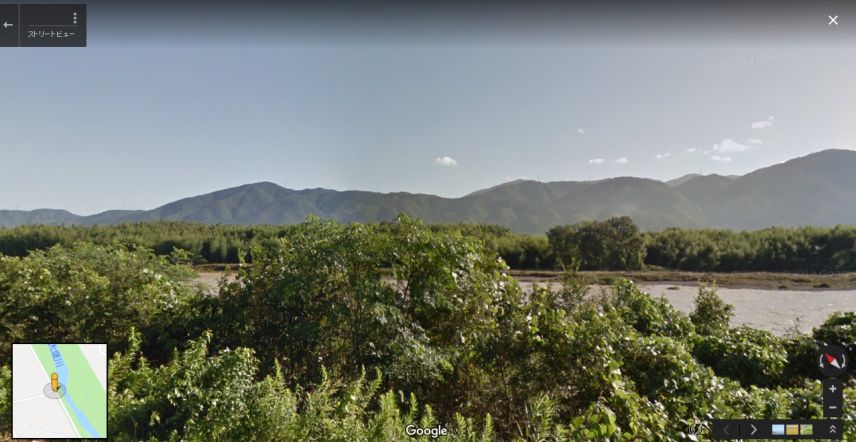| グーグルのストリートビューの画像。増水時らしく河原が見えない。 ↓ |