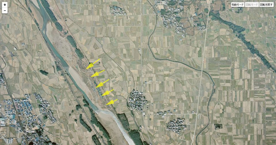| 国土地理院の「国土変遷アーカイブ」による現地周辺の1975年撮影の航空写真。黄色い矢印あたりの河原で撮影したと思われる。 ↓ |