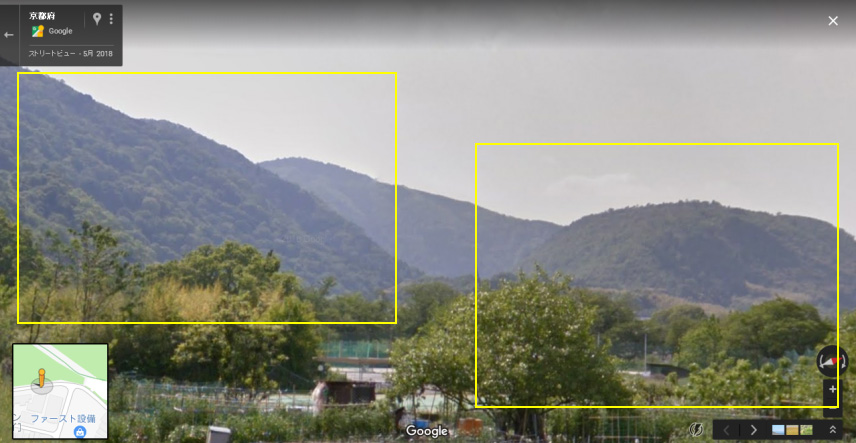 京都の嵐山の桂川右岸から取得したグーグルのストリートビューの画像。右の黄枠が画像A、左の黄枠が画像Bと酷似。ロケ場所は桂川の河原であろう。